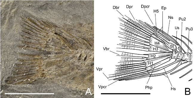 Caudal skeleton. The caudal skeleton is relatively well preserved; only the posterior portion of the caudal fin rays, and some procurrent rays on the lower lobe, are lost. This bone complex shows the preural centra (Pu) 3 and 2, urostyle, parhypural, five autogenous hypural plates, one uroneural (stegural), and two epurals (Table 2).