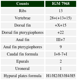 Axial skeleton. The anterior portion of the axial skeleton is not preserved. No prezygapophysis or apophysis is observed. By the presence of ribs and anterior neural spines, it is possible to suggest that the axial skeleton has at least 28 vertebrae, 13 abdominals (or more) and 15 caudal (Table 2). The antero-ventral portion of the axial skeleton includes 13 pairs of long and thin ribs. The anterior ribs are partially preserved; while the posteriors are curved to the posterior portion of the body. The vertebral centra are progressively smaller and more elongated. The haemal spines of the two centra anterior the origin of the anal fin vertebrae are stout and short. The others, similar to all neural spines visible, are thin and long structures, curved towards the posterior portion of the body.