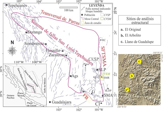 La reactivación de fracturas de enfriamiento ha motivado diferentes investigaciones enfocadas a entender qué papel juegan durante la nucleación de fallas en rupturas sísmicas, la propagación y el enlace de fracturas hidráulicas en la producción de hidrocarburos, la dirección del transporte de fluidos para yacimientos minerales, y la distribución de la temperatura en fluidos dentro de la corteza superior (Rutqvist et al., 2013; Taleghani et al., 2014, Álvarez del Castillo, 2017). Hasta ahora, los trabajos sobre reactivación de las fracturas de enfriamiento en rocas volcánicas que influyan en la evolución de sistemas de fallas son pocos (Segall y Pollard, 1983; Pennacchioni et al., 2006) y, menos aún, aquellos que contribuyan a entender qué papel juegan dentro de la configuración de importantes sistemas de fallas normales en México. En este trabajo documentamos cómo la evolución y crecimiento de fallas frágiles normales en rocas volcánicas pueden estar influenciados por la reactivación de algunas fracturas de enfriamiento. En el centro de México, cerca del límite entre las provincias fisiográficas Sierra Madre Oriental (SMO) y la Mesa Central (MC), en el campo volcánico San Luis Potosí (CVSP) y específicamente en el Complejo Volcánico Santa María (CVSM) (SGM, 2004) (Figura 1) se tiene el caso ideal. En esta región, la cubierta volcánica cenozoica está compuesta básicamente por ignimbrita y riolita y está afectada por tres sistemas de fallas bien definidos. El primer sistema es el Taxco-San Miguel Allende (SFTSMA) de rumbo general N-S. El segundo, el más notable en el área de estudio y en el que hemos enfocado nuestra investigación, es el (SFSLT), un grupo de fallas normales con orientación N20°-50°W (Figura 1). Y por último están las fallas de rumbo NE-SW que incluyen al Graben Villa de Reyes (GVR).