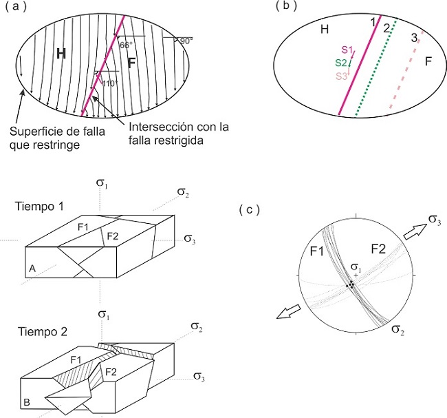La interacción de fallas normales es uno de los rasgos más característicos de las zonas en extensión de la corteza terrestre. La interacción cinemática entre dos planos de falla puede producir perturbaciones del campo de esfuerzo en la vecindad de sus intersecciones, desviándose de la dirección en la que las cizallas máximas del tensor de esfuerzo remoto se resuelven sobre ellas. Este efecto ha sido documentado por datos de trabajo de campo (Mouslopoulou et al., 2008; Xu et al., 2013a) y por algunos modelos numéricos basados en la teoría de elasticidad lineal (Pollard et al., 1993; Maerten, 2000). La interacción entre fallas tiene tres efectos. El primero es que las orientaciones de desplazamiento cambian dependiendo de la distancia a la línea de intersección (Figura 10a). En el segundo efecto, el ángulo de pitch de las estrías en la misma ubicación cambiará con el tiempo, debido a los cambios de posición de la línea de intersección entre los dos planos (Figura 10b). El movimiento de la ubicación de la intersección es causado por la traslación o rotación de los bloques durante el fallamiento (Xu et al., 2013b). El tercer efecto se debe a la interacción cinemática de dos fallas (Figura 10c). Si dos fallas se intersectan el movimiento de una falla puede estar condicionada por la otra, de tal manera que una de las fallas no se podrá mover hasta que se alcance la diferencia de esfuerzos necesaria para mover la otra falla (Nieto-Samaniego y Alaniz-Álvarez, 1997). El movimiento resultante que se da será el del bloque contenido entre las dos fracturas dando como resultado tres direcciones de estrías, una de ellas paralela a la intersección de las dos fallas.