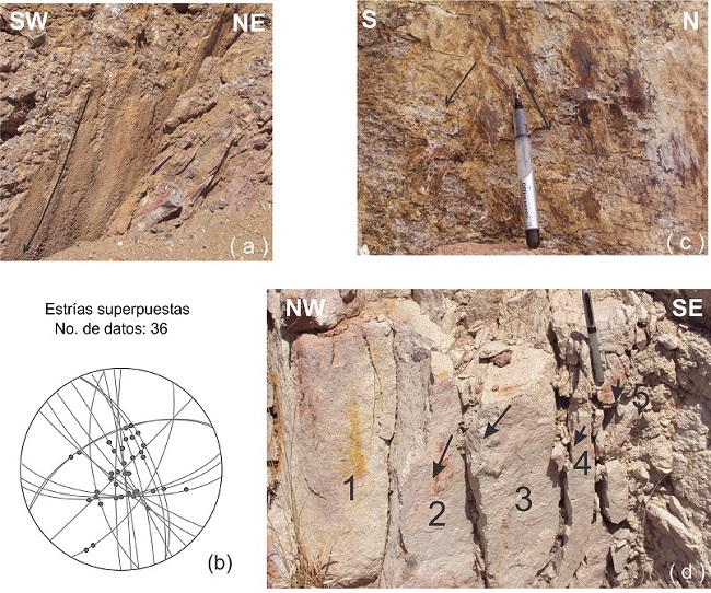 En la zona de estudio, observamos los efectos de la interacción de fallas en el desarrollo de estrías. El efecto común es que las líneas superpuestas, las de forma de arco y aquellas en zigzag se pueden formar debido a la interacción entre las fallas que se cruzan (Figura 11d). Para las líneas curvas (Figura 11a), los cambios en los ángulos de inclinación son comúnmente menores a 30° (Xu et al., 2013b). En el caso de la Figura 11b, las fracturas NW-SE no podrán tener deslizamiento (aunque tengan orientación favorable con extensión máxima al NE-SW), si son cortadas por las fracturas verticales (con orientación no favorable N-S y NE-SW), el deslizamiento en los planos se dará hasta que el esfuerzo diferencial alcance el valor para mover las fallas verticales. En la mayoría de los casos, las estrías superpuestas en las fallas del área estudiada tienen una diferencia angular mayor que 40°. Por ejemplo, en la Figura 11c, la diferencia en los ángulos de pitch entre los dos sets de líneas de deslizamiento es 43°, en el estereograma de la Figura 11b se observan las estrías ubicadas en la intersección de dos fallas.