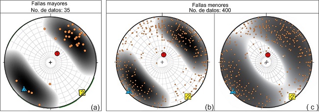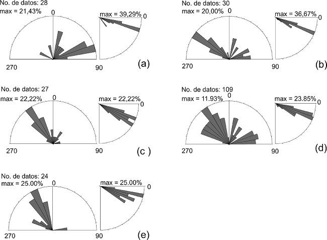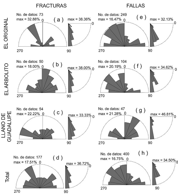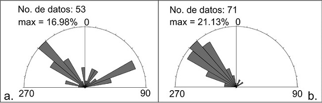 Para este trabajo medimos en imágenes aéreas los lineamentos de más de 300 m de longitud, obteniendo dos rumbos preferentes: NW y NE (Figura 7a), que son similares a los rumbos de las fracturas medidas en campo (Figura 4) y al rumbo de los domos riolíticos emplazados durante el Oligoceno tardío (ver Figuras 2, 3, 6 y 7 en Tristán-González et al., 2009).
