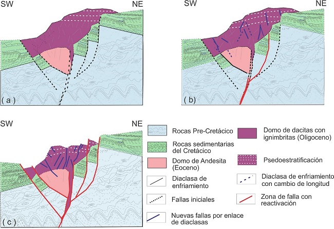 El análisis de la geología, las fracturas de enfriamiento o diaclasas y de las fallas normales dentro del CVSM, su relación con los lineamientos regionales, el alineamiento de domos riolíticos emplazados a lo largo de fallas, el basculamiento en las unidades litológicas, y el papel que juega la profundidad en la reactivación, nos permiten proponer un modelo de evolución del sistema de fallas normales presentes en la región de estudio.