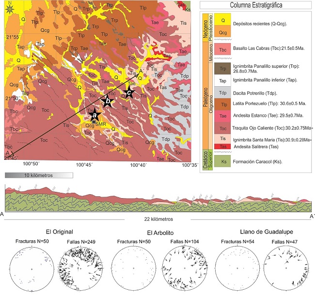 Las unidades cenozoicas que afloran en la zona de estudio han sido descritas detalladamente por Labarthe-Hernández et al. (1984) y Aguillón-Robles et al. (2004), cartografiadas a detalle y fechadas por el método K-Ar, roca entera, por Tristán-González et al. (2009), básicamente son: Andesita Salitrera (Tas, 31.9 ± 0.7 Ma), Ignimbrita Santa María (Tis, 32.5 ± 0.8 y 31.3 ± 0.7 Ma), Traquita Ojo Caliente (Toc, 31.8 ± 0.7 Ma y 31.6 ± 0.7 Ma), Andesita El Estanco (Tae, 29.5 ± 0.7 Ma), Latita Portezuelo (Tlp, 30.6 ± 1.5 Ma, 31.0 ± 0.7 Ma), Dacita Potrerillo (Tdp), Ignimbrita Panalillo (dos miembros Tap y Trp, 28.9 ± 0.5 Ma y 25.4 ± 0.6 Ma), que ocasionalmente están separados por coladas del Basalto La Placa (Tbp 26.9 ± 0.4 Ma) y Basalto Las Cabras (Tbc, 21.5 ± 0.3 Ma). Todas estas fechas fueron obtenidas mediante el método K-Ar por Tristán-González et al. (2009).