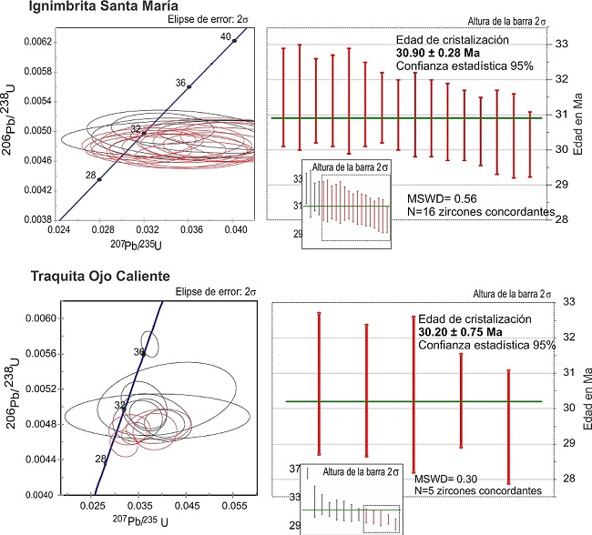 En este estudio nos centramos en la Ignimbrita Santa María (Tis) y la Traquita Ojo Caliente (Toc), la primera es una roca de color gris-rosáceo, de textura porfirítica-eutaxítica, con fenocristales de cuarzo y sanidino, y estructuras tipo fiammes. Su base está marcada por la presencia de vitrófidos negros lenticulares. La segunda corresponde a una roca leucocrática, holocristalina, con presencia de sanidino, plagioclasa y esporádicos cristales de piroxeno. Estas dos unidades presentan la superposición de estrías de falla generadas por tectonismo, sobre las estructuras lineales de las fracturas de enfriamiento. Las edades que obtuvimos para estas unidades, usando el método U-Pb en zircón (LA-ICPMS, media ponderada), son 30.9 ± 0.28 Ma para la Ignimbrita Santa María y 30.20 ± 0.75 Ma para la Traquita Ojo Caliente (Figura 3). Las fechas que reportamos en este trabajo son un poco más jóvenes que las edades K-Ar reportadas en trabajos anteriores.