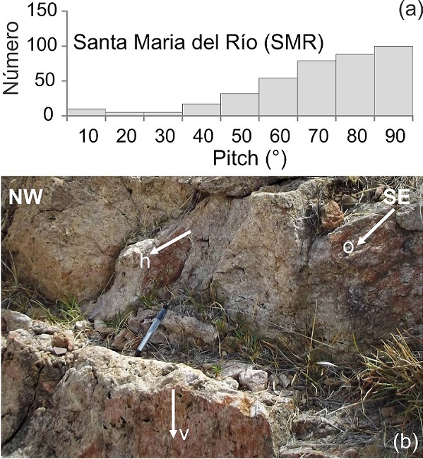 Los rumbos preferentes observados en las fallas muestran su paralelismo con los dos sistemas de falla regionales: el Sistema de Fallas San LuisTepehuanes (NW-SE) y el Sistema de Fallas Taxco-San Miguel Allende (~N-S). Una de las formas de clasificar la cinemática de las fallas es en función del pitch de las estrías sobre los planos de falla (Figura 5). En la zona de estudio se tienen fallas de 3 tipos: con pitch menores que 30° asociados con fallas laterales, las menos abundantes en el área de estudio (Figura 5a), con pitch entre 31° y 70° propios de fallas oblicuas normales y con pitch mayor que 70° que consideramos propias de fallas normales y que son las más abundantes en este estudio (Figura 5a).