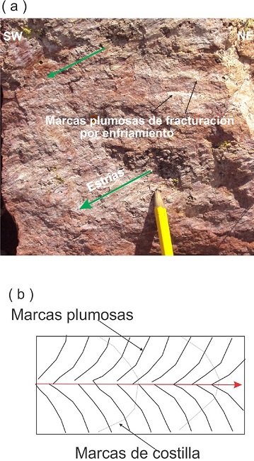 Un ejemplo de que los planos de enfriamiento actuaron como fracturas preexistentes de fallamiento en el sector de Santa María del Río se muestra en la Figura 8a, donde se observa estrías de falla soberpuestas a marcadores (o estrías) de enfriamiento, comúnmente plumosos, o de costilla como el que se esquematiza en la Figura 8b. En las estructuras plumosas, una vez que se activa una terminación de grieta (desde algún punto o vértice débil), el frente de la grieta avanza rápidamente generando dichas estructuras. Sin embargo, pueden detener su propagación debido a que llegan a zonas más plásticas o de mayor temperatura (Ryan y Sammis, 1978). Cada marca delgada en el lado de una columna o fractura de enfriamiento registra una dirección de propagación, que a su vez puede variar longitudinalmente y pueden diferir de las estrías previas (DeGraff y Aydin, 1987; Goehring, 2013).