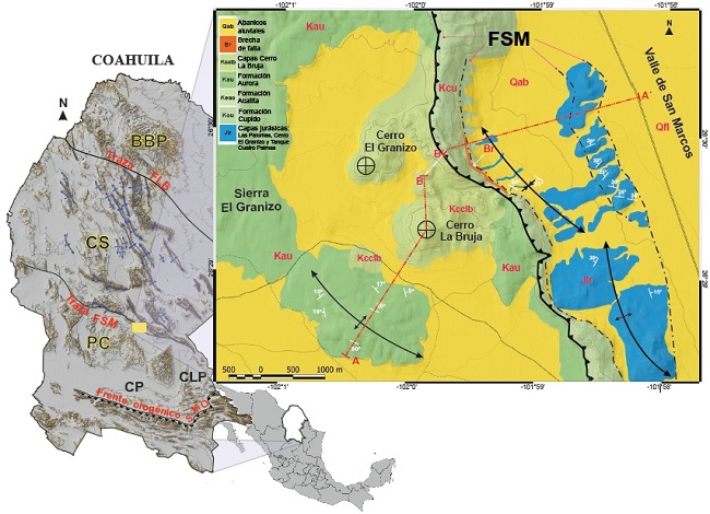 Al noreste del área de estudio se encuentra la sierra de San Marcos y Pinos (SSMP), la cual alcanza altitudes mayores a los 2100 m.s.n.m. y está formada por dos anticlinales asimétricos que unen sus ejes para formar una sola estructura orientada NNW-SSE. Ambas estructuras tienen ejes que varían su buzamiento de E-W hacia el NNW y tienen vergencia al WSW (Chávez-Cabello et al., 2005). Bolaños-Rodríguez (2006) definió en la parte norte de la SSMP dos anticlinales menores, Atalaya y Churince, en cuyo núcleo se aloja la Formación San Marcos.