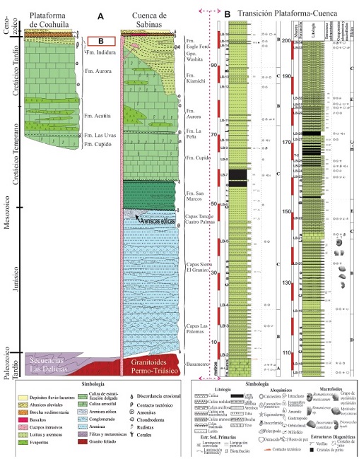 Las CCLB es una unidad sedimentaria marina predominantemente calcárea depositada en un ambiente pelágico de cuenca con influencia de terrígenos, del Cenomaniano Tardío hasta el Turoniano Tardío (Alonso-Manuel, 2016). Dicha unidad, con un espesor preservado de poco más de 200 m, está conformada principalmente por una intercalación de lutita calcárea y caliza arcillosa, con horizontes de lutita negra tanto en la base como en la cima de la unidad, así como horizontes de caliza con microbrecha de restos de peces hacia la cima y escasos horizontes de material volcánico y yeso (Alonso-Manuel, 2016; Figura 2). En un trabajo paralelo a este, se realizó un análisis de microfacies e interpretación de las estructuras sedimentarias presentes, con lo que se logró demostrar que el ambiente y las condiciones paleoambientales de depósito de las CCLB eran de rocas pelágicas de cuenca, depositadas en un margen pasivo local, antes de la reactivación inversa de la FSM (Alonso-Manuel, 2016). Las CCLB se correlacionan hacia el norte en la cuenca de Sabinas con la Formación Eagle Ford (Eguiluz de Antuñano, 2001; Harbor, 2011), y hacia el sur en la cuenca de Parras con la Formación Indidura (Kelly, 1936; Imlay, 1936; Duque-Botero, 2008). Las tres unidades se depositaron durante el Cenomaniano al Turoniano, sobreyacen a rocas calcáreas y comparten ciertos taxones de amonites e inoceramidos (Alonso-Manuel, 2016). Sin embargo, las CCLB no comparten exclusividad litológica ni de estructuras sedimentarias con alguna de las dos formaciones. Considerando las microfacies, se concluyó que la sucesión de capas CCLB estudiadas muestran una transición de cuenca (Fm. Eagle Ford) a plataforma (Fm. Indidura), ubicada probablemente entre la plataforma profunda y/o pie de talud, pues para este tiempo posiblemente tenían una batimetría similar entre sí (Alonso-Manuel, 2016, Figura 2).
