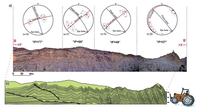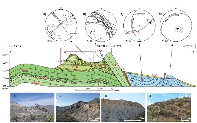 El análisis estereográfico y las relaciones estratigráficas y de contacto de todas las unidades que afloran en el área de estudio se muestran a lo largo de la sección geológica A-A´ (Figura 3). Cabe destacar que en dicha figura se muestra la deformación por acortamiento de las CCLB, la cual se manifiesta en trenes de pliegues tipo chevron delimitado por fallas en la cima y en la base. El análisis del acortamiento de las CCLB es objeto de estudio en el presente trabajo, por lo que será descrito con mayor detalle en la sección posterior.