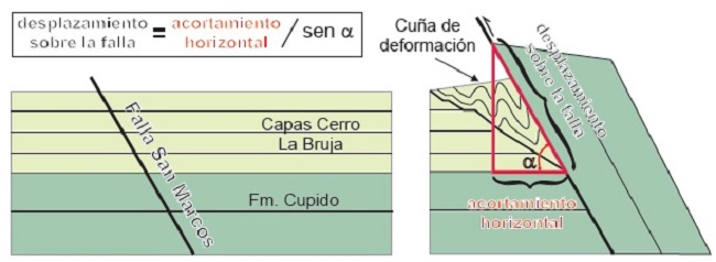 El análisis de desplazamiento de la FSM tiene como base la premisa de que el acortamiento horizontal de las CCLB se puede correlacionar con su causa: el desplazamiento sobre el plano de la FSM a través de un triángulo rectángulo (Figura 8). Dado que estimamos el acortamiento horizontal de la cuña de pliegues chevron en las CCLB (cateto adyacente del triángulo), y el ángulo entre este cateto y la hipotenusa corresponde al ángulo de echado promedio del plano de falla, entonces el cateto opuesto es el acortamiento vertical de la falla y la hipotenusa correspondería al desplaza miento sobre el plano de falla (Figura 8).