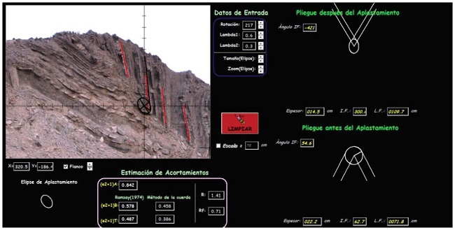 Para los pliegues de la clase 1C con flancos atenuados y charnela abultada, el programa usa la relación del plegamiento de Vásquez-Serrano (2010) para el cálculo de la deformación por aplastamiento (post-buckling) en los pliegues chevron. En donde el arco externo de la charnela dibuja una elipse con centro en el arco interno. Dicha elipse representa el strain debido a aplastamiento. Una vez estimado el aplastamiento el programa calcula el acortamiento debido a la deformación activa (buckling) mediante los métodos de Ramsay (1967 y 1974). Posteriormente, se suman ambos tensores, (e2+1)B (acortamiento por buckling) y (e2+1)A acortamiento por aplastamiento) para calcular el acortamiento total del pliegue (e2+1)T (Figura 6).