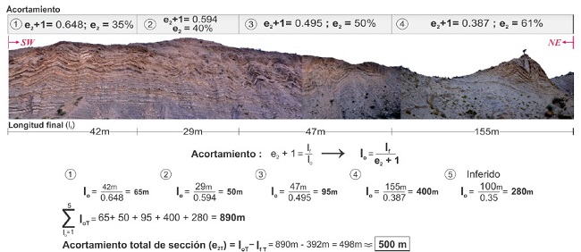 Finalmente, una vez calculado el acorta miento horizontal para cada pliegue, se calculó la media aritmética para cada segmento. Considerando la longitud horizontal final de cada segmento y la fracción de acortamiento promedio, y posteriormente, considerando la longitud de cada segmento, se determinó el acortamiento total en metros, el cual fue de aproximadamente 500 metros (Figura 7). Dichos cálculos fueron comparados, validados y/o complementados donde fue posible con el método de la cuerda, descrito previamente en la Figura 7.