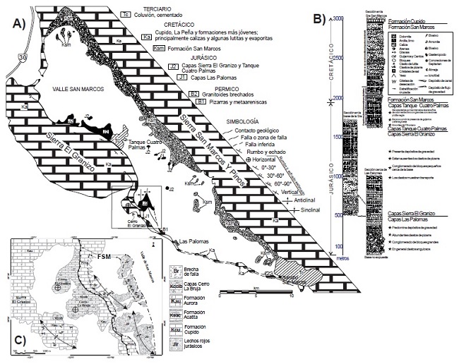 En el mapa geológico (Figura 1), se observa un sistema de fallas asociadas con la Falla de San Marcos, dichas fallas controlan los contactos lito-lógicos en el extremo norte del área de estudio, ya que sobreponen a la Formación Cupido (Kcu) de edad Aptiano sobre las Capas Cerro La Bruja (Kcclb) de edad Turoniano, y otra falla subpara- lela yuxtapone, a su vez, a lechos rojos del Jurásico Tardío (Jlr) con la Formación Cupido. Más al norte, McKee et al. (1990) sugieren la presencia de otra falla subparalela a estas dos que sobrepone a rocas metasedimentarias del basamento, sobre las capas clásticas del Jurásico.