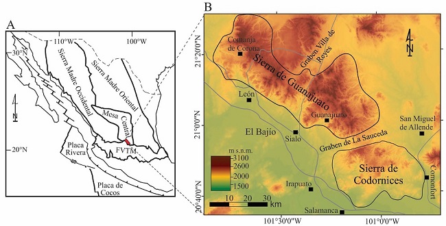 En el área de estudio hay dos entidades orográficas: (1) la Sierra de Guanajuato (SG) es una serranía de forma alargada con dirección NW-SE, que se extiende por aproximadamente 100 km de largo y 35 km de ancho desde la región Comanja de Corona, Jalisco, hasta el Graben de La Sauceda; y (2) la Sierra de Codornices (SC), que se extiende desde el graben de La Sauceda hasta Comonfort, mide aproximadamente 45 km en dirección NW y 40 km en dirección NE (Figura 1B). En conjunto, ambas sierras conforman el bloque levantado de una semifosa tectónica de edad Eoceno-Oligoceno, que limita a la cuenca de El Bajío (Botero-Santa et al., 2015).