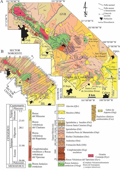 La Sierra de Guanajuato y Sierra de Codornices se ubican dentro de dos provincias geológicas, la Sierra Madre Occidental (SMOc) (Faja Ignimbrítica Mexicana en la nomenclatura de Ortega-Gutiérrez et al., 1992) y la FVTM. La SMOc se extiende en dirección NW-SE, está formada por una pila de ignimbritas y domos mayormente de composición riolítica. Estas rocas volcánicas fueron emplazadas durante dos pulsos magmáticos principales, uno de edad Oligoceno temprano (32-28 Ma) y otro del límite Oligoceno tardío-Mioceno temprano (24-20 Ma, Ferrari et al., 2005). La FVTM es una provincia volcánica que se extiende en dirección E-W en el centro de México, de composición principalmente básica, cuyas edades van del Mioceno medio hasta el Holoceno. Estas rocas se han interpretado como un arco volcánico asociado a la subducción de las placas de Cocos y Rivera (e. g. Ferrari et al., 2005).