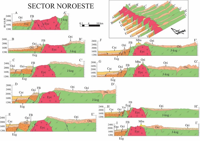 Este sector comprende parte de la Sierra de Guanajuato y parte del Graben de Villa de Reyes (GVR), e incluye las secciones A a I, todas ellas de rumbo general NE-SW viendo al NW (Figuras 2B y 3). En el sector NW se puede observar un contraste geomorfológico importante, la parte SW tiene cotas cercanas a 1800 m s.n.m., en la zona que ocupa la cuenca continental denominada El Bajío; en contraste, en la parte elevada, que corresponde a la Sierra de Guanajuato, las cotas varían entre 1900 y 2850 m s.n.m. En este sector, las rocas del Jurásico-Cretácico afloran con cotas máximas de hasta 2700 m s.n.m., y en la cuenca El Bajío se interpreta, con base en la información disponible de pozos (Ramos-Leal et al., 2007a) y los espesores reportados de las unidades que las cubren, que se ubican en cotas inferiores a 1500 m s.n.m., según las secciones D, F y G.