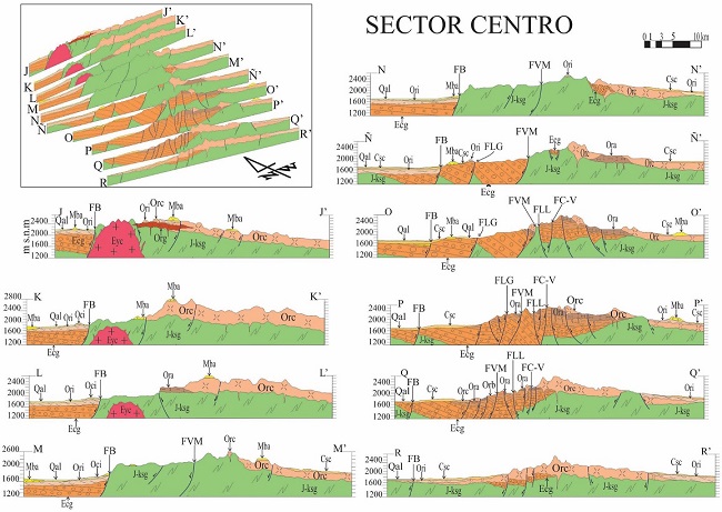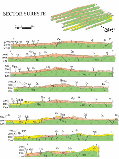 Este sector abarca la mitad SE del graben de La Sauceda hasta el extremo SE del área de estudio, e incluye las secciones S a Z (Figura 2B y 5), todas ellas de rumbo general NE-SW viendo al NW. En este sector el desnivel topográfico va de 1700 a 2400 m s.n.m. y son pocos los afloramientos de rocas del Jurásico-Cretácico. En las secciones S a X las rocas del Jurásico-Cretácico no afloran, mientras que en las secciones Y y Z se encuentran pequeños afloramientos de ellas. La cota máxima de los afloramientos de rocas del Jurásico-Cretácico es de 2000 m s.n.m. (sección Y-Y’) y la cota mínima interpretada en el subsuelo es de 1300 m s.n.m. (sección X-X’). Los conglomerados eocénicos son escasos (secciones U y X) y presentan echados de hasta 30°. Dada la escasez de conglomerados eocénicos, la gran discordancia que descansa sobe las rocas del Jurásico-Cretácico representa hiatos mayores en este sector; en las secciones V a Z los basaltos del Mioceno descansan directamente sobre las rocas del Jurásico-Cretácico y en las secciones Y y Z esa discordancia separa a las rocas del Jurásico-Cretácico de las rocas del Rupeliano. Las estructuras principales de este sector son las fallas del graben de La Suceda, la Falla de San Miguel de Allende, que forma un medio graben orientado N-S, la Falla del Bajío, con una traza no tan evidente en comparación con los sectores NW y Centro, y la falla de la caldera La Ordeña, que corta rocas del Mioceno.