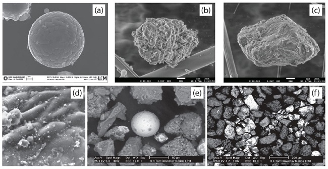 Large amounts of heavy metals are found in fly ashes emitted from coal-burning power plants and industrial smelters (e.g., Petrovský and Ellwood, 1999; Szuszkiewicz et al., 2015). Heavy metals like As, Cd, Zn, and Pb, and probably also Br, Cr, and Mn, enrich most fly ash and are associated with small respirable particles (Maher and Thompson, 1999). Industrial fly ash also contains iron oxides such as magnetite and hematite. Magnetite and hematite, as well as maghemite, limonite, and magnesioferrite can be primary minerals. However, magnetite and hematite are formed mainly during the burning process in power plants through the oxidation of pyrite, marcasite, and siderite, but also ankerite and jarosite (Vassilev and Vassilev, 1996; Evans and Heller, 2003). Before being burned, coal is essentially non-magnetic. The combustion causes pyrite to dissociate and form pyrrhotite and sulfur gas. Above 1077 ºC pyrrhotite decomposes into sulfur and iron. In this process spherical iron particles of about 20 µm in diameter are formed and subsequently oxidize to magnetite (Evans and Heller, 2003). On average, 16% of coal burned in a power station becomes ash and about 16% of this ash is magnetic. In general, the particle size distribution of the burned coal fly ash is defined by the size of the pulverized coal and the temperature of combustion (Flanders, 1999). Furthermore, magnetite and hematite are produced during combustion from clay containing iron in coal through the growth of molten crystals, the reduction of Fe oxide by carbon and hydrogen, and Fe hydroxides dehydroxylation (Vassilev and Vassilev, 1996; Kapička et al., 1999). The processing of steel and the production of cement are further sources of iron oxide minerals (Petrovský and Ellwood, 1999). Cd, Cu, Pb, Zn, Cr, and Ni are derived from traffic and industrial emissions, mining, sewage sludge, pesticides, and fertilizers (Wei and Yang, 2010). Magnetite in fly ash in general appears as discrete rounded grains with a diameter between 1 and 10 µm, or as dendrites and octahedra in the glass (Petrovský and Ellwood, 1999). Hematite has been found as platy specularite or lamellar crystals, often forming rose-like shapes (Petrovský and Ellwood, 1999). The combustion of fossil fuel raises the concentration of magnetite from 10 ppm in the unburnt fuel to 500-10000 ppm in the combusted fuel; in the case of coal ash the magnetite content may rise up to 160000 ppm (Petrovský and Ellwood, 1999). Coal-fired fly ashes are rich in magnetite with grain sizes ranging from small single domain (SD) to large multidomain (MD) grains, with the largest grain size fraction from 2 to 50 µm. Magnetite mostly occurs as spherules, sometimes with an “orange peel” surface (Petrovský and Ellwood, 1999; Yang et al., 2007).
