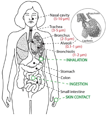 Potentially harmful elements, such as heavy metals, can be absorbed in human bodies through inhalation, ingestion, and dermal contact (e.g., Bourliva et al., 2017). Inhalation directly exposes the lungs to airborne metals and is therefore considered a primary route of entry into the body (Hu et al., 2012). The size of the particles is a main determinant of where in the respiratory tract they will come to rest when inhaled (Figure 4). Because of their small size, PM10 particles can penetrate the deepest part of the lungs such as the bronchioles or alveoli. Larger particles are generally filtered in the nose and throat via cilia and mucus. The 10 μm size has been agreed upon for monitoring of airborne PM by most regulatory agencies. Similarly, PM2.5 can pass through into the lung and can irritate and corrode the alveolar walls (Xing et al., 2016). Ultra-fine particles may be more dangerous than larger particles, on the one hand, because of dosimetric effects, and on the other hand, they may serve as catalysts for reactions with cells because of their larger surface area per given mass (Oberdörster, 2001). Furthermore, ultrafine particles may pass through the lungs and reach the blood circulation and further into extrapulmonary tissues and organs (Oberdörster, 2001).