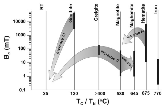 By gradually lowering the temperature below Tc, the thermal energy overcomes the magnetic anisotropy until the remanent magnetization blocks in at the blocking temperature (Tb). With increasing grain size, Tb approaches Tc. Natural samples usually have a broad grain size distribution so that the maximum Tb is often equivalent to Tc (Liu et al., 2012). Through the substitution of iron with titanium, saturation magnetization Ms decreases and Tc decreases nearly linearly (Evans and Heller, 2003).