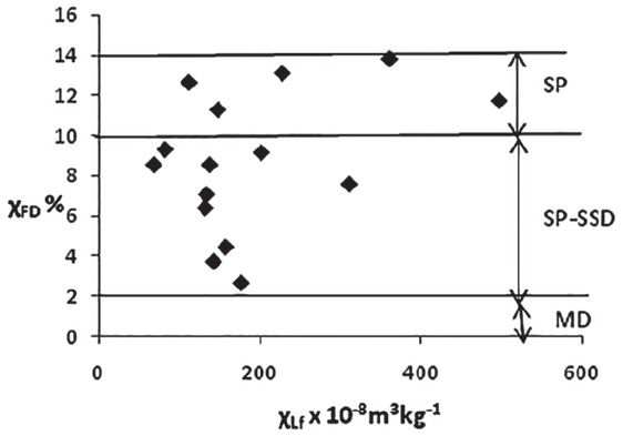 Magnetic susceptibility mostly depends on the concentration and grain size of ferromagnetic (s.l.) as well as the contribution of para- and diamagnetic particles in a rock. For magnetite, magnetic susceptibility at low frequencies (klf or χlf) is remarkably constant over a wide range of grain sizes; it is, however, particularly sensitive to magnetite ultrafine magnetite particles, e.g., superparamagnetic (SP) particles in the 0.01-0.03 µm grain-size range. The frequency dependence can be used to detect these very small grains (Forster et al., 1994; Dearing et al., 1996). The frequency dependence of magnetic susceptibility (kfd or χlf), using magnetic susceptibility at low and high frequency (klf or χlf, and khf or χhf), respectively, is defined as kfd = ((klf − khf)/klf) × 100%. At a low frequency ω, corresponding to a period, 1/ω, larger than the relaxation time (1/ω > λ), SP grains contribute strongly to the susceptibility. Whereas the same grain becomes SD at high frequencies corresponding to a period smaller than the relaxation time (1/ω < λ). At a low frequency, SP grains equilibrate and can have higher susceptibilities than single domain (SD) grains. It is suggested that samples with kfd > 10% have dominating contribution of SP particles (Dearing et al., 1996). The frequency dependence of magnetic susceptibility reflects the concentration of SP grains, and particularly those close to the threshold SP-SD, that is 0.015-0.025 µm for magnetite (Maher, 1988). SD particles are extremely stable carriers of remanent magnetization with frequency‐independent magnetic susceptibilities. In contrast, SP particles just below the blocking volume of SD are unable to retain a stable remanence, but their susceptibilities are highly frequency dependent. The actual magnetic behavior of ultrafine magnetic particles, i.e., the observation of a SP or blocked state, largely depends on the value of measuring time (tm) of the specific experimental technique with respect to the relaxation time (t) (Wang et al., 2010). Figure 6 shows an example of frequency-dependent magnetic susceptibility at a college in Jalingo, Nigeria. Values of χFD > 10% indicate a large contribution of SP particles. The scattergram shows that the largest contribution to magnetic susceptibility is due to SP ferromagnetic grains <0.05 µm (Kanu et al., 2014).