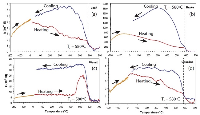 Continuous thermomagnetic curves, which are magnetic susceptibility or saturation magnetization versus temperature (χ-T or Ms-T curves), in a saturation field of 1 T, are measured to determine the predominant magnetic minerals in the sample and their thermal stability (Goguitchaichvili et al., 2001). For the high-temperature curves, samples are usually heated to temperatures up to 700ºC and subsequently cooled to room temperature, while the magnetic susceptibility or magnetization is monitored. Commonly, the Curie temperature, which is typical for each magnetic mineral, is determined from the heating curve. The thermal stability is highest if heating and cooling curves overlap completely. The low-temperature thermomagnetic curves χ-T are measured while the sample is heated from temperatures as low as about −196ºC to room temperature. An example of low- and high-temperature thermomagnetic curves is shown in Figure 6 for four different materials (Sagnotti et al., 2009). In the low-temperature thermomagnetic curve an increase with maxima at −60ºC for the brake sample (Figure 7b) and at −30 to −50ºC for the other specimens was observed. In the high-temperature part of the thermomagnetic curves a Tc of ~580ºC was observed in the heating curve for all specimens, indicating magnetite as the main magnetic mineral.