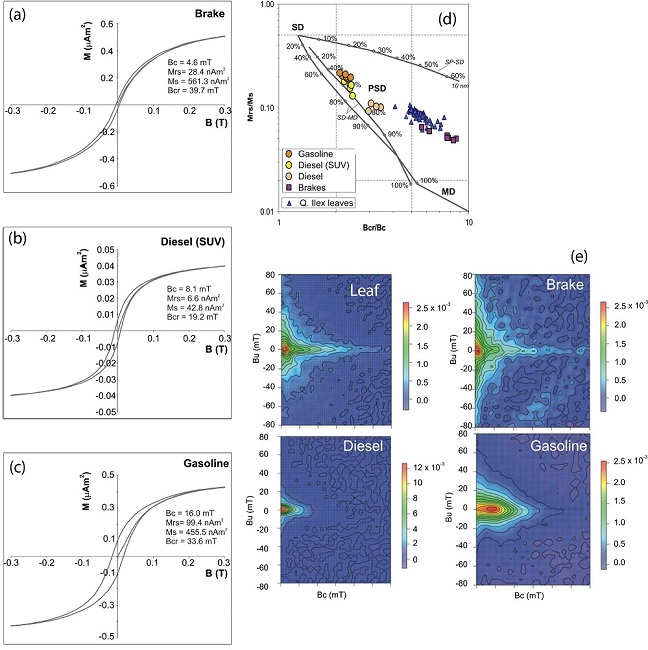 Shu et al. (2001) showed that the combined magnetic and geochemical analysis in urban and industrial environments can jointly support the classification of different sources. Dust samples were collected at eleven locations across Shanghai, China. Magnetic susceptibility at low frequencies (χlf) and saturation isothermal remanent magnetization (SIRM) values are largest at sites with highest concentrations of Fe, Mn, Ni, V, and Zn. This correlation confirms that ferrous particles and magnetic spherules in emissions from heavy industry and coal-fired power plants are the main causes of high ferrimagnetic concentrations. Furthermore, magnetic measurements indicate that magnetite MD and PSD grains are largely produced in fossil-fuel combustions.