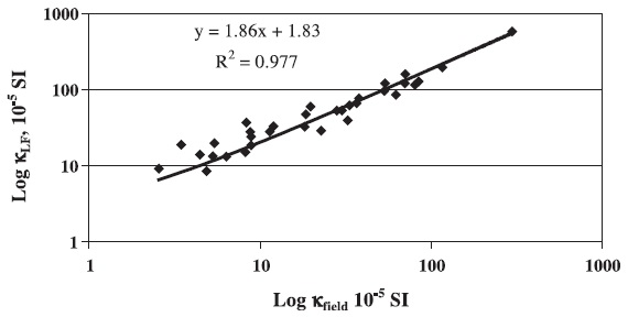 Boyko et al. (2004) tested the repeatability of magnetic susceptibility mapping in two field campaigns on 129 sites in North and West Austria on a regular grid of 10 × 10 km and on a high-resolution grid of 2 × 2 km in the polluted Steyreggerwald near the town of Linz. The measurements obtained with a Bartington Instruments MS2D handle were compared with magnetic susceptibilities of soil reference material taken at the measured sites. The Bartington handle measures susceptibilities in the top 6-8 cm, whereas for the reference material the upper 3.5 cm of the topsoil were sampled. Boyko et al. (2004) found significant correlation between magnetic susceptibilities from the readings in the field with the ones of the reference material. Especially for the high-resolution grid, the 33 topsoil measurements reveal high correlation (R2 = 0.98; Figure 9). Factors that affect the repeatability of the field measurements are, for example, inhomogeneities within the measured place, positional precision, different equipment sets, plant cover, and anthropogenic activity.