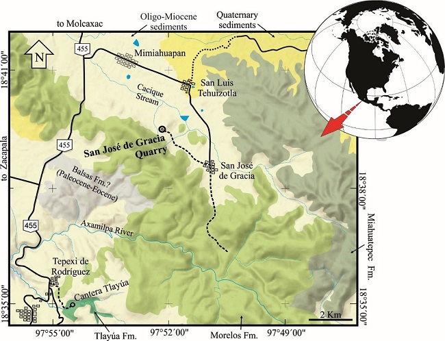 Maps already published by Servicio Geológico Mexicano (2006) show that the Oligocene-Miocene continental deposits of the Coatzingo Formation are exposed around the town of San José de Gracia (Figure 1). The base of this continental formation is composed of limestones with some intercalated flint horizons that are covered with a sequence of volcanic ash and sand layers deposited in a lacustrine environment of low energy within the Zacapala Basin (Beraldi-Campesi, 2003). The lithology of the San José de Gracia quarry does not match with that of the Coatzingo Formation; hence, there is no possibility that the rocks of this new locality belong to that formation.