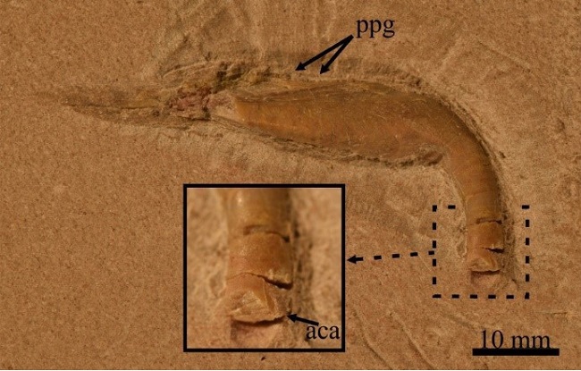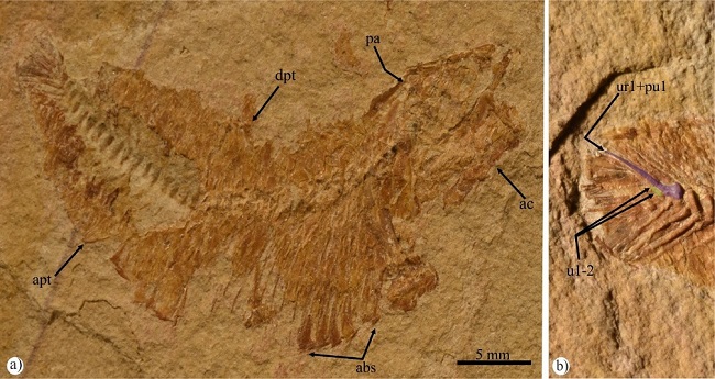 This fossil preserves seventy vertebrae showing the shape of thread reels, in which the intervertebral articulation surfaces are wide and massive while their middle part is strongly constricted. Although, the vertebrae are about 1.5 time longer than high in the abdominal region; they tend to be less long. The last two vertebrae preserved in this specimen, probably the first preural centra, are slightly higher than long. A single transverse process laterally rises from the anterior half of each abdominal centra. At least 40 vertebrae are abdominal and attach with thin preural ribs. The neural and hemal spines are short and curved backward. Numerous epineurals and epipleurals are present all along the trunk.