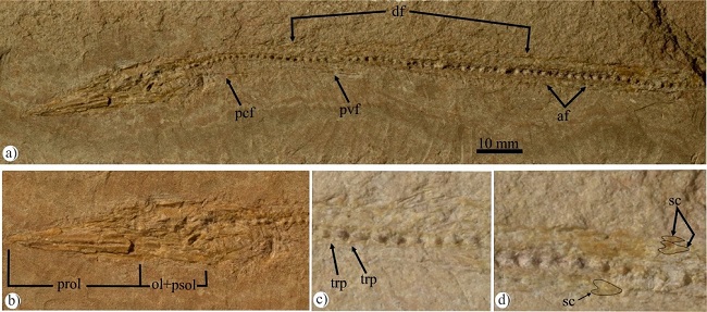 The pectoral fin is not preserved; however, in the pectoral girdle the cleithrum is a C shaped bone that is slightly widened at its ventral end. Behind this bone, there are two postclithra, the dorsal one is ovoid and the ventral one is rod-like. The single visible dorsal pterygiophore shows that the dorsal fin rises near to the middle of the SL. There are 10 visible anal pterygiophores showing that the anal fin is located between 75 and 82.5% of the SL (30 and 35 mm). The pelvic and caudal fins are not preserved.