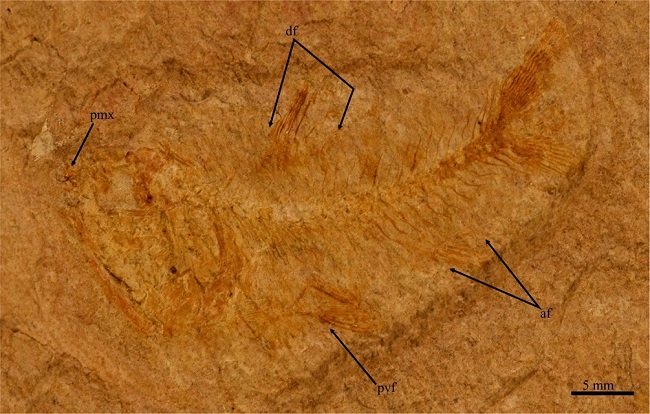 Description: This almost complete specimen preserved in part and counterpart shows the trunk strongly curved, reaches 40 mm of standard length (SL), with none of its fins is preserved. In life this should be a chubby fish, with a triangular head and a shallow caudal peduncle, in which the maximum height of the trunk was about 13 mm.
