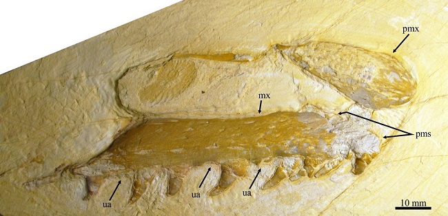 Eight conical teeth and three empty alveoli are placed on the maxillary alveolar border; these are ordered following the dental formula 1, 2, 3, 4, x, 6, x, 8, 9, x, 11. The teeth have ankylosed crowns; they have broad bases protruding from the alveolar maxillary edge. All teeth are entirely smooth and strongly curved backward. In cross section, teeth are rounded at the base, oval in the middle part, and form a weak anterior cutting edge or carina near to the tip (Figure 7).