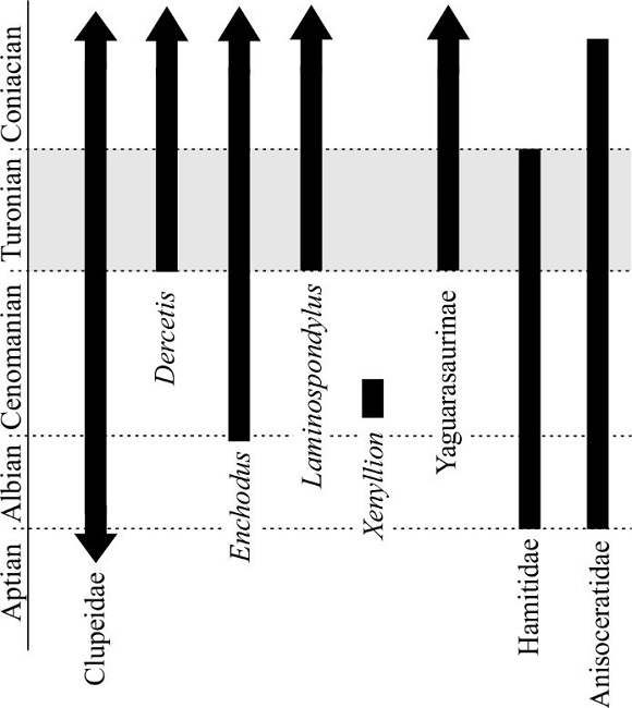 If the temporal distributions of Hamitidae and Anisoceratidae ammonites, the pelecypod Inoceramus labiatus, and the vertebrates described above are considered, it is possible to attribute a Turonian age to the fossiliferous strata exploited in the San José de Gracia quarry (Figure 8). For the moment, the formal studies of all the fossil invertebrates and the possible microfossils of San José de Gracia are pending; once these are developed, it will be possible to reach a more accurate age for this deposit.