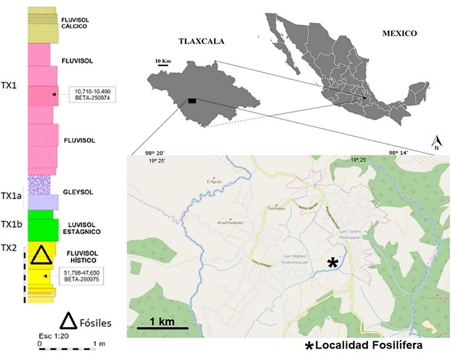 La comunidad de San Mateo Huexoyucán se ubica al norte del municipio de Panotla, en las carreteras federales en dirección San Simeón Xipetzingo, en el estado de Tlaxcala (INAFED, 2010). El pedocomplejo de la Barranca de San Mateo Huexoyucán se ha clasificado como un fluvisol hístico; sus niveles fosilíferos forman parte de una secuencia de fluvisoles (Figura 1) con una datación estimada de radiocarbono de 46320 ± 870 años A.P. y una edad calibrada de 51798 ‒ 47650 años A.P., correspondiente al Rancholabreano en el Pleistoceno tardío (Sánchez-Salinas et al., 2016).