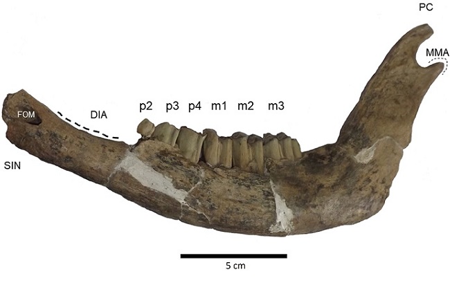 Descripción. El elemento es largo y esbelto, de 37.7 cm de largo, sin incisivos, con un foramen mental profundo y ovalado de 1.4 cm de diámetro, el diastema es esbelto y no está elevado (Figura 2). La serie post-canina está completa: el p2 es triangular y con una fosetida en forma de “V”; la corona del p3 está fragmentada y tiene una fosetida en forma de “U” y otra de “V”, mientras que en el p4 sus fosetidas tienen en forma de “U”, “V” y otra ovoide, con costillas bien definidas; los molares están desgastados, robustos y tienen el borde labial en forma de “M”; el m1 está fragmentado, las fosetidas tienen forma de “8”, el ectostilido tiene forma ovoide; el m2 tiene fosetas en forma de “8”, con ectostilido roto y con forma de gota. El grado de desgaste m3 sugiere un individuo adulto, las fosetidas tienen forma de “8” y el ectostilido es triangular y desgastado.