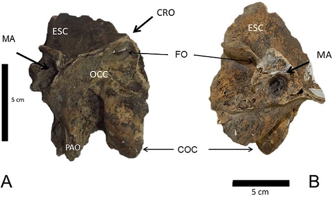 En vista dorsal, el escamoso es cóncavo y tiene dos forámenes, uno pequeño y ovalado, mientras que el otro es grande, profundo y cercano al meato auditivo externo; se puede ver la cresta sagital externa la cual es gruesa; la cresta occipital está fragmentada. En vista lateral se puede observar un foramen accesorio del meato temporal, el cual es grande y profundo, seguido por el meato auditivo externo de 2.9 cm, amplio, plano y profundo, rodeado por un labio prominente y fragmentado; detrás de éste se encuentra el foramen mastoideo reniforme. En la parte posterior el ejemplar BUAPALZ-983 conserva un cóndilo occipital plano y triangular de 3.5 cm; el proceso paraoccipital tiene forma de gancho, es plano lateralmente y sobrepasa el cóndilo occipital largo y triangular (Figura 3).