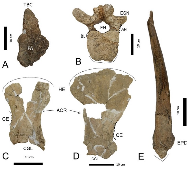 BUAPALZ-1101 escápula derecha fragmentada de 36.8 cm de largo, hoja escapular completa y con el borde redondo, con el acromion roto y proyectado lateralmente; la cavidad glenoidea de 8.5 cm es amplia, rectangular, cóncava y fragmentada, no conserva la espina escapular, el cuello escapular es estrecho y corto, de 11.5 cm, y presenta un pequeño tubérculo fragmentado (Figura 4d).