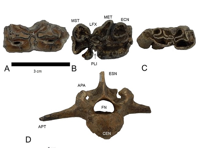 Descripción. Vértebra aislada de 19.45 cm de largo, con la espina neural fragmentada y el foramen neural elíptico; las apófisis articulares craneales están conservadas, son pequeñas y cóncavas, las caudales son convexas. El cuerpo vertebral completo, de 6.2 cm de largo, es elíptico y la cresta ventral está fragmentada. Las apófisis transversas son planas, fragmentadas y se inclinan dorsoventralmente (Figura 5d).