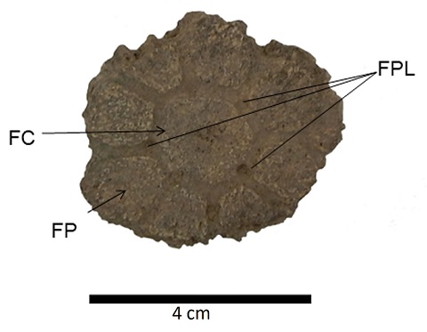 Descripción. Osteodermo aislado de contorno hexagonal de 5.5 cm de largo; su figura central es plana, ligeramente cóncava y abarca la mitad del material referido; el surco marginal es visible con tres folículos pilosos y ocho figuritas periféricas visibles que son más pequeñas que la figura central (Figura 6).