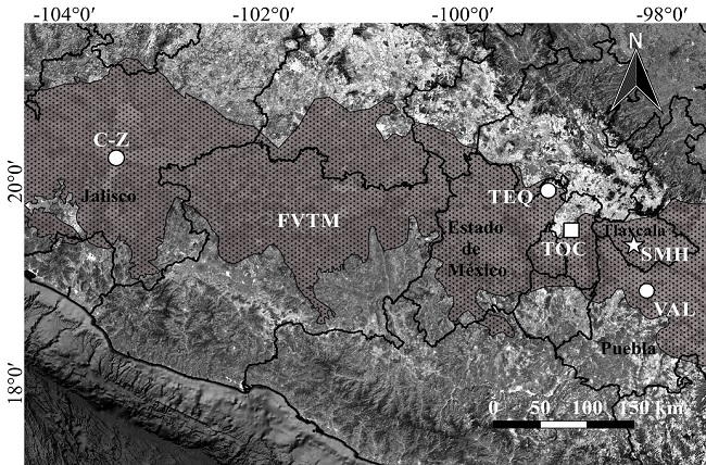 Los ejemplares revisados corresponden a una asociación de mamíferos herbívoros pleistocénicos incluyendo Artiodáctilos (Bison antiquus, Camelops hesternus), proboscídeos (Cuvieronius hyodon, Mammuthus sp.), équidos (Equus conversidens, Equus mexicanus) y gliptodontes (Glyptotherium), los cuales corresponden con una asociación de mamíferos herbívoros rancholabreanos y concuerdan con los registros previos (Bonilla-Toscano, 2011; Ramírez-Cruz y Montellanos-Ballesteros, 2014; Sánchez-Salinas et al., 2016). La combinación de los siete taxa encontrados en este estudio se presenta para los sitios de Chapala-Zacoalco en Jalisco, Tequixquiac en el Estado de México y Valsequillo, Puebla (Ceballos et al., 2010; Ferrusquía-Villafranca et al., 2010), siendo San Mateo Huexoyucán, la cuarta localidad en el país con este ensamble de megafauna (Figura 7). Es interesante observar que esta combinación de megafauna sólo se presenta en la provincia morfotectónica de la Faja Volcánica Transmexicana (Ferrusquía-Villafranca et al., 2010).
