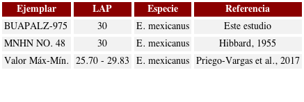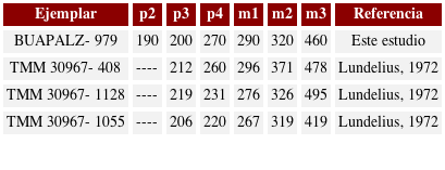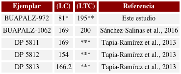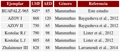Los ejemplares fueron comparados con ejemplares juveniles de Mammuthus trogontherii reportados por Fisher y colaboradores (Fisher et al., 2014) y Maschenko y colaboradores (2013), en los cuales el acromion se proyecta lateralmente y el cuello de la escápula es estrecho (Fisher et al., 2014) al igual que en los ejemplares estudiados. Se tienen registros de Mammuthus en la localidad de San Mateo Huexoyucán, Tlaxcala, los cuales son ejemplares adultos (Sánchez-Salinas et al., 2016), sin embargo, sólo se cuenta con registros de ejemplares juveniles en Tocuila, Estado de México, para el país (Morett et al., 1998; Arroyo-Cabrales et al., 2002).