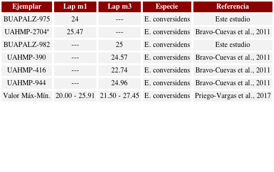 Discusión. La configuración de los linguafléxido de los molariformes inferiores de Equus mexicanus presenta forma de “V” (Hibbard, 1995; Bravo-Cuevas et al., 2011; Alberdi et al., 2014; Priego-Vargas et al., 2017), características presentes asimismo en el molar estudiado. Al comparar el ejemplar BUAPALZ-975 con el de Equus mexicanus reportado por Hibbard (1955), se encontró que el ejemplar de Tlaxcala es similar en medidas al ejemplar proveniente de la Cuenca de México, aunque ambos sobrepasan los valores máximo y mínimo para esta especie reportados por Priego-Vargas y colaboradores (2017), sin embargo Equus mexicanus se caracteriza por ser un équido pleistocénico de talla grande, a decir de Winans, 1989; Bravo-Cuevas et al., 2011; Alberdi et al., 2014; Priego-Vargas et al., 2017, que identifican al ejemplar BUAPALZ-975 como Equus mexicanus (Tabla 5).
