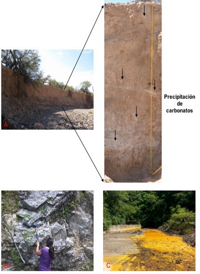 Se colectaron tres tipos de muestras: 1-materiales edafosedimentarios carbonatados (Figura 1A) ubicados al norte del estado de Sonora (N31º02´26.3´´, W112º03´15.2´´, 548 msnm), 2- la roca caliza (Figura 1B) y 3-drenaje ácido de mina (Figura 1C) en Taxco, Guerrero (N18º31´53´´ y O99º35´37´´, 1412 msnm).
