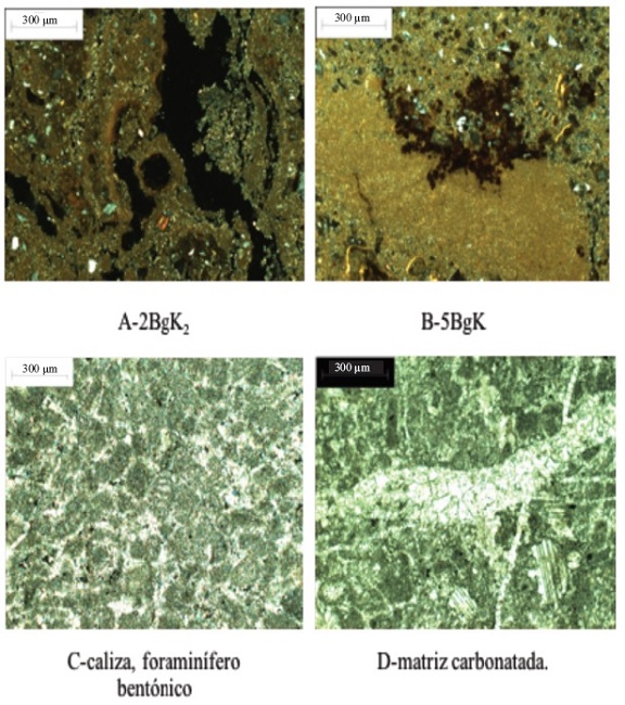 Adicionalmente se tomaron muestras inalteradas para la elaboración de láminas delgadas de los horizontes: 2Bgk, 4Bk y 5Bgk del edafosedimento y de la caliza para estudios micromorfológicos. Las muestras se secaron y se impregnaron con resina Poliéster, posteriormente se realizaron cortes hasta obtener una lámina delgada con un grosor de aproximadamente 30 micras. Las láminas fueron observadas y descritas con ayuda de un microscopio petrográfico Olympus BX 51 y una cámara Cool Snap.