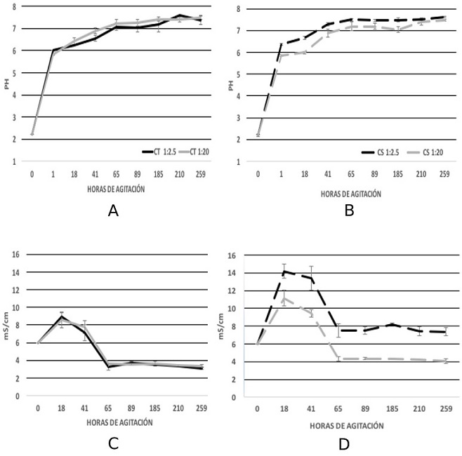 Los resultados de las cinéticas de la conductividad eléctrica se encuentran en la Figura 3C y 3D. En la relación 1:2.5. en CT a las 18 hs de agitación registró un aumento de este parámetro respecto al valor inicial del DAM de CEpromedio=8.9mS/cm. La concentración decreció considerablemente a las 65hs, con CEpromedio=3.29 mS/cm. Posterior a este tiempo, inició la estabilización, y alcanzó un valor final de CEpromedio=3.09 mS/cm.