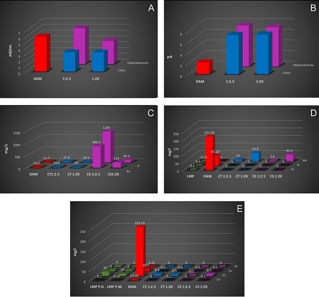 El Na+ y Cl- en los dos tipos de sedimentos mostraron diferente tendencia. Las concentraciones finales de las pruebas en lote fueron altas en CS relación 1:2.5. El incremento final del catión y anión, junto con una conductividad eléctrica elevada, indica la presencia de sales en forma de NaCl (véase Figura 4C). CS es un edafosedimento que en su caracterización química inicial presentó un pH muy básico y una alta conductividad eléctrica; estas dos propiedades químicas se atribuyen a la presencia de sales en los suelos. Las sales presentes en CS al entrar en contacto con el DAM se solubilizaron y como consecuencia la conductividad eléctrica no bajó en las pruebas.