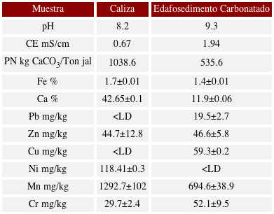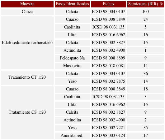 La Tabla 1 muestra la composición química elemental del edafosedimento (CS) y de la caliza (CT), determinados por FRX. Los elementos predominantes en CT son: Ca=42.65%, Fe=0.17%, Mn=1292.7 mg/kg, Ni=118.41 mg/ kg. En CS los elementos predominantes son: Ca=11.9%, Fe=1.4% y Mn=694.6 mg/kg.