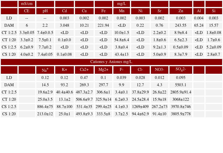 Con respecto al drenaje ácido de mina (DAM), se midió en laboratorio su pH y su conductividad eléctrica (CE). Posteriormente, el DAM se filtró con papel de nitrocelulosa con diámetro de 0.45 µm para los análisis químicos. Para la cuantificación de metales y metaloides solubles se utilizó un equipo ICP-OES Perkin Elmer modelo 8300DV. Para la cuantificación de los cationes y aniones mayoritarios se empleó cromatografía iónica con el equipo Metrohm 883 Basic IC Plus.